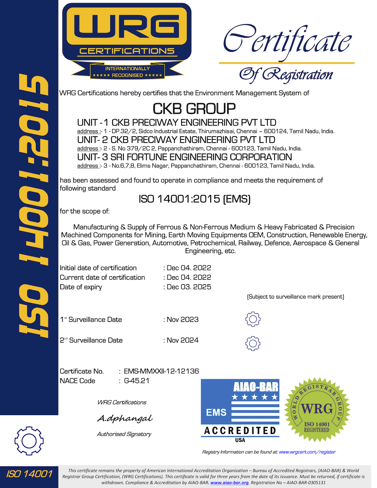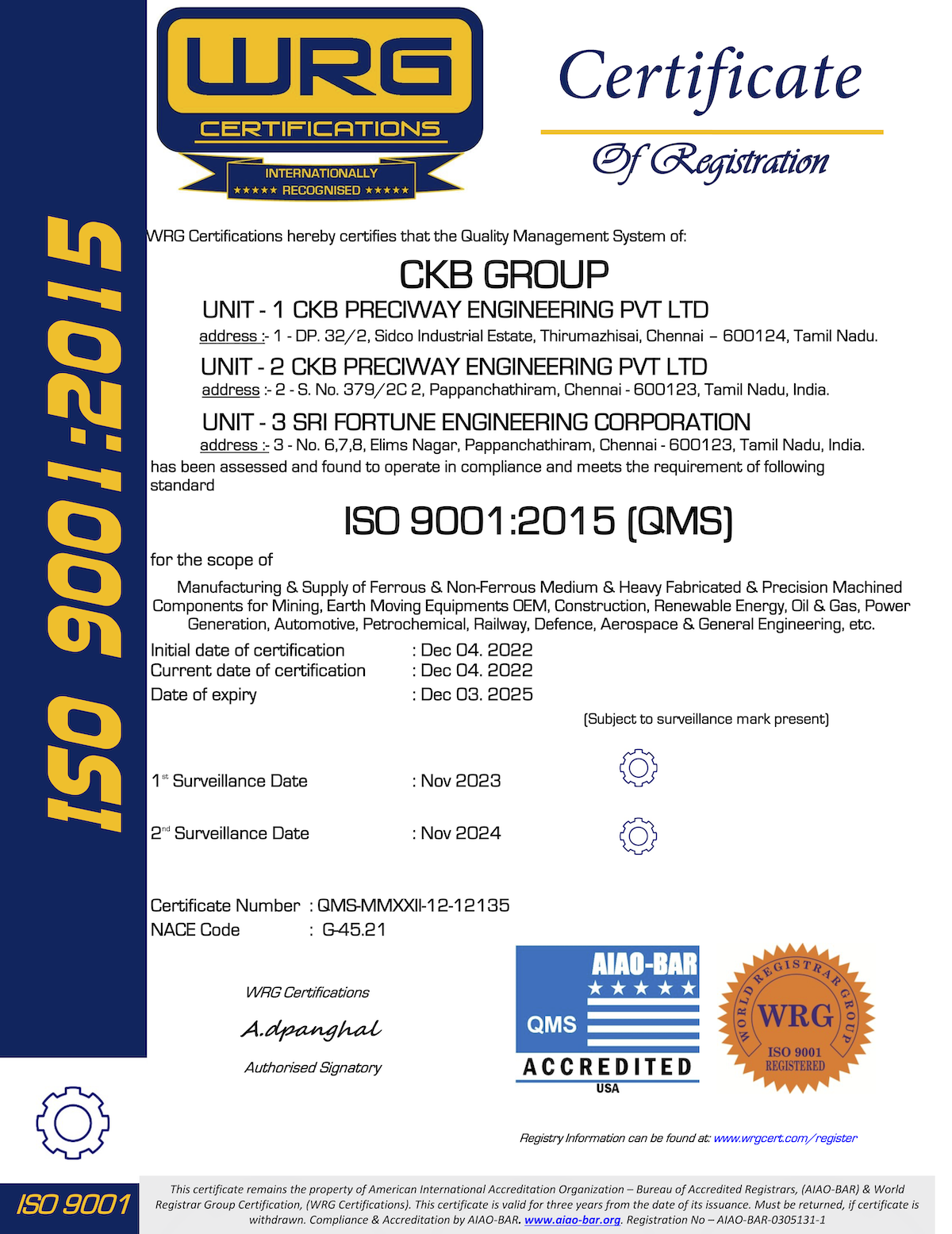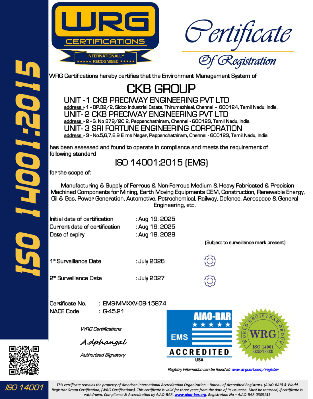 "CKB GROUP" Committed to Achieve Total Customer Satisfaction, Understanding and Fulfil the Needs and Expectations of Our Interested Parties by Delivering Reliable, Competitive, Quality Products and Services by Effective Management and Employee Involvement Through Continual Improvement in Quality, Environmental, Health and Safety Management System.